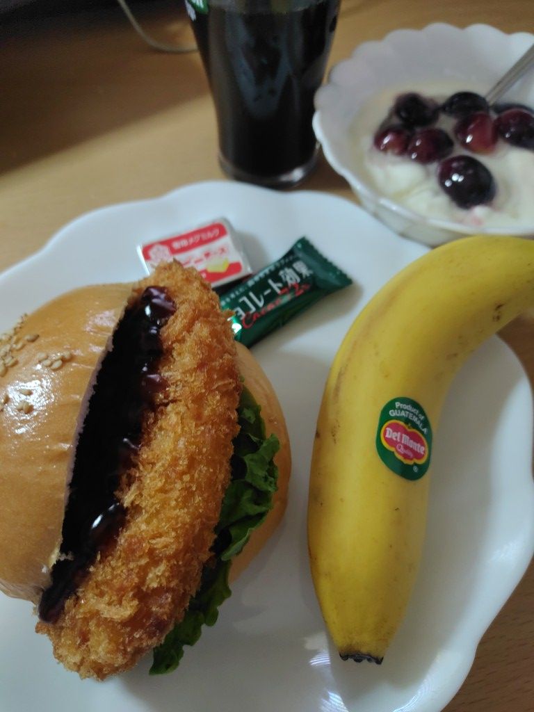 昨晩、遅くにスーパーへ行ったときに30オフの牛肉コロッケハンバーガーにヨーグルトにドライフルーツを足してベビーチーズにカカオ72%のチョコレート1個(5g)でバナナを1本です。